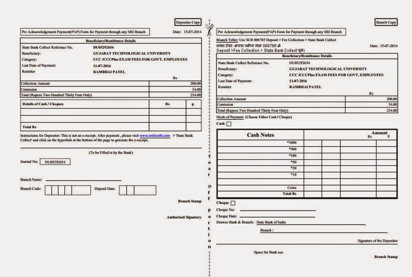 બાદમાં આ મુજબ માહિતી લખી પર ક્લિક કરો. Submit કરશો એટલે ચલણ આવશે એની જરૂરી પ્રિન્ટ કાઢી. તે ચલણ સ્ટેટબેંક માં ભરી દેવું.
